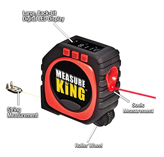 Le 3- en 1  est le meilleur mesureur de ruban au monde. Le ruban 3-en-1 assure une précision de trois façons . Le mode bande à bande utilise une chaîne de mesure traditionnelle en nylon souple qui peut se plier autour des objets. Le mode de piste de roulement vous permet de mesurer des courbes et des objets différents simplement en le roulant sur la surface - vous pouvez mesurer jusqu'à 999 pouces! Et le mode laser vous permet de mesurer à travers la pièce ou de grandes distances avec le clic d'un bouton.