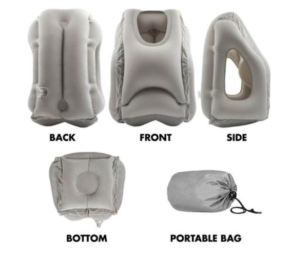 - L'oreiller de voyage gonflable peut être utilisé de différentes façons, y compris avec le visage pointé vers le bas, avec la tête inclinée sur le côté, ou même avec le menton posé sur le dessus.