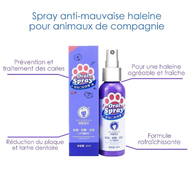 Ce spray anti-mauvaise haleine aux extraits naturels limite la formation de la plaque dentaire, permet une élimination efficace de la mauvaise haleine de votre animal renforce la santé des gencives et contribue à une bonne hygiène.