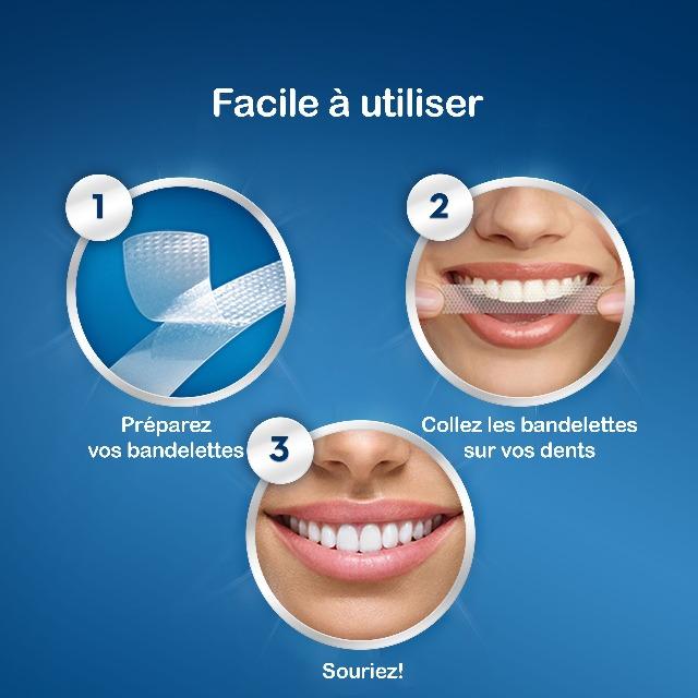 Les bandes de blanchiment des dents sont à appliquer durant 30 minutes une fois par jour. Vous commencez à voir les résultats au bout de 3 jours. Leur action repose sur le peroxyde d’hydrogène qu’elles renferment : il agit sur les molécules qui colorent l’émail.