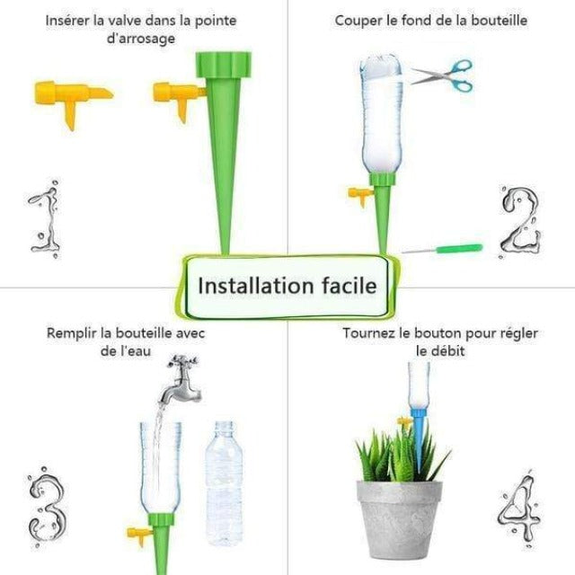 - Système d'arrosage automatique goutte à goutte qui s'adapte à la majorité des bouteilles en plastique.